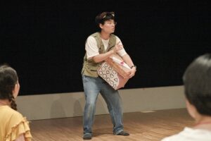 Q2.河童に扮して、お客様と皿回しに挑戦するという役どころだったのですが、皿回しに真剣に挑戦してくれたり、二日目にもう一度チャレンジに来てくれたり、ジャグリングの技に素直に喜んでくれる子どもたちの姿が印象的でした。コロナが明け、お客様と直接やり取りすることのできるツアー型演劇の素晴らしさを改めて実感しました。ただ、若干、大道芸人だと思われていましたが、私は俳優です(笑)。