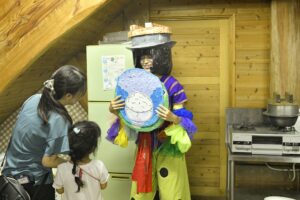 Q2.影絵クイズで遊ぶ雪女をやっていたのですが、お客さんの反応に委ねる部分が大きかった分、何が起こってもなんとかするぞ~位のゆったりとした、「上演する」というよりお客 さんと「おしゃべりする」ような心持ちでいました。最初そっけなかった子が、帰り際ピタっとくっついてくれて、雪女の凍てついた心も融けました…。