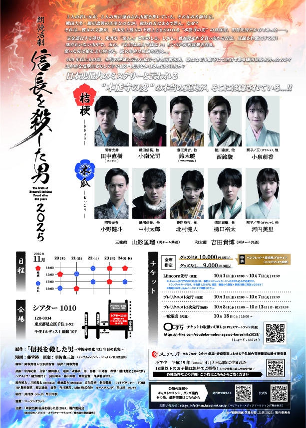 「朗読活劇 信長を殺した男 2025」は明智光秀の新たな実像を描いた大ヒット歴史コミックを原作に、2021年に初演、23、24年とダブルキャストでの上演を繰り返す人気作品。今回は主役・明智光秀役を、お笑い芸人や俳優としても活躍するココリコの田中直樹と、ミュージカル『新テニスの王子様』などで活躍を続けている小野健斗が務める。好評の生演奏の三味線に今年は新たに和太鼓も加わり、11/20~24、北千住・シアター1010にて上演される。 日本史最大のミステリー「本能寺の変」の多くの謎に満ちた“真相”がドラマチックに解き明かされてゆく本作に主演として出演する2人より、メッセージが到着した。