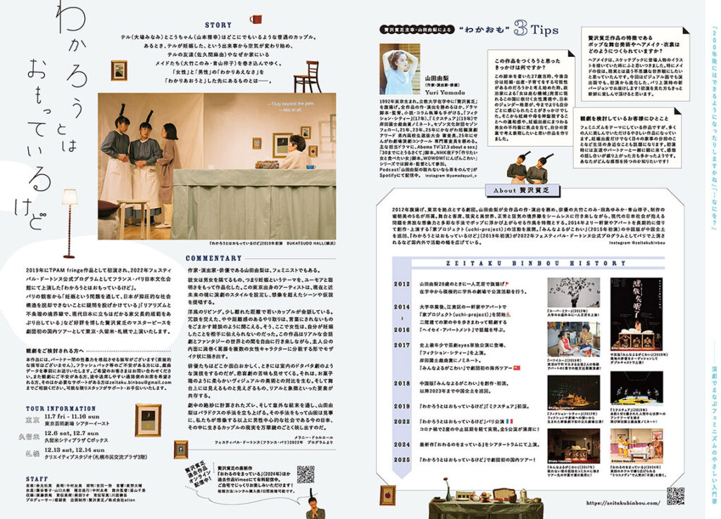 現代日本社会が抱える諸問題を “奔放な想像力と多彩な手法でポップに描く作風” で評価の高い「贅沢貧乏」の『わかろうとはおもっているけど』が11月7日から東京芸術劇場シアターイーストで上演される。本作は2019年に初演、22年にフェスティバル・ドートンヌ公式プログラムとしてパリで上演され「リアリズムと不条理の境界線で、現代日本に立ちはだかる家父長的規範をあぶり出している」などと好評を博した「演劇で学ぶフェミニズムのやさしい入門書」。この劇団の代表作を初の国内ツアーとして東京・久留米・札幌で上演!「女性」と「男性」の「わかりあえなさ」を「わかりあおうと」した先にあるものとは・・・?