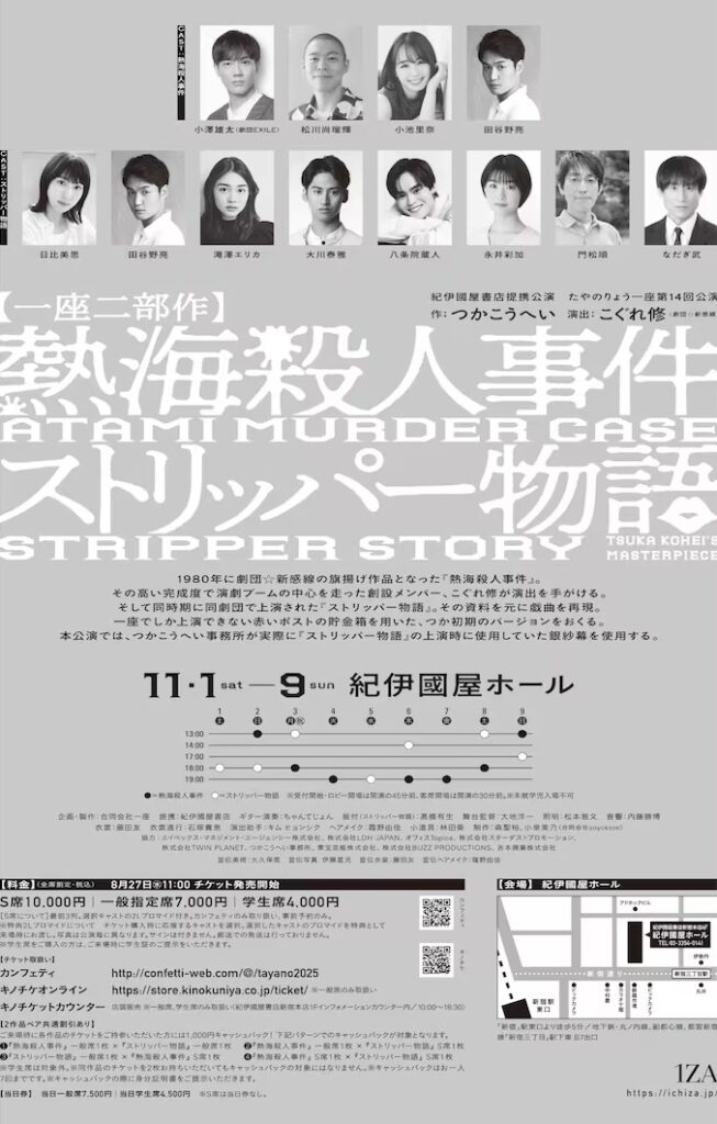 つかこうへいの2作品『熱海殺人事件』『ストリッパー物語』が11月1日〜9日、紀伊國屋ホールで一挙に上演される。演出は1980年の劇団☆新感線の旗揚げ公演『熱海殺人事件』で木村伝兵衛役を演じた俳優・演出家のこぐれ修で、出演者には座長の田谷野亮をはじめ、小澤雄太(劇団EXILE)、日比美思がそれぞれの作品で主役を務める。