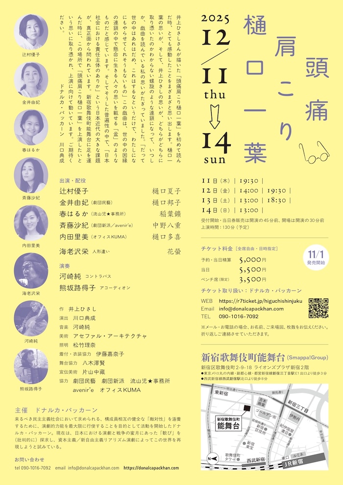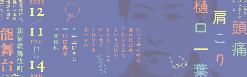 こまつ座旗揚げ公演として初演され大好評を博した井上ひさしの代表作『頭痛肩こり樋口一葉』を新宿歌舞伎町の能舞台で上演したいという思いに取り憑かれた(本人談)ドナルカ・パッカーンの川口典成が演出、12月に上演する。