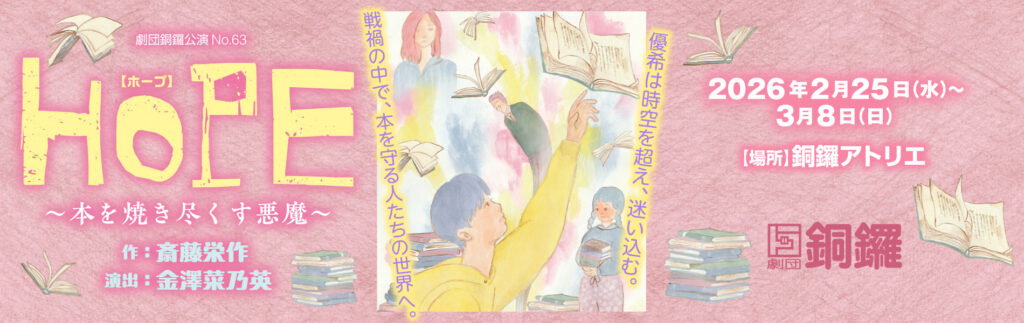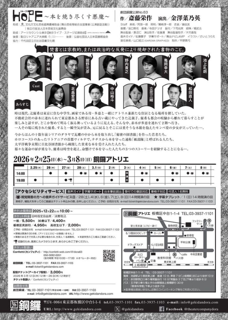 命が危険に晒されても、戦火から「本」を守った人たちが居ました。絶望の淵で大切な人の顔を思い浮かべながら、“いつか誰かが手に取るかもしれない”と未来へバトンを繋ごうとした先人たち。そんな激動を駆け抜けた姿を想像し、1人の俳優が複数役を兼任して息を吹き込もうとしています。それぞれのシーンの演じ分けにより浮かび上がる人物の対比や共通点を発見すると、私たちの“今”と向き合うことと重なり、過去はそう遠くなく未来を見据えるような感覚になります。