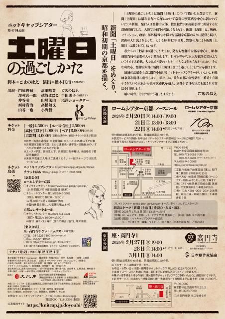 京都を拠点に活動し、今年で27年目を迎える劇団ニットキャップシアターが、新作公演『土曜日の過ごしかた』を、2月に京都公演をロームシアター京都 ノースホール、東京公演を座・高円寺1にて上演する。