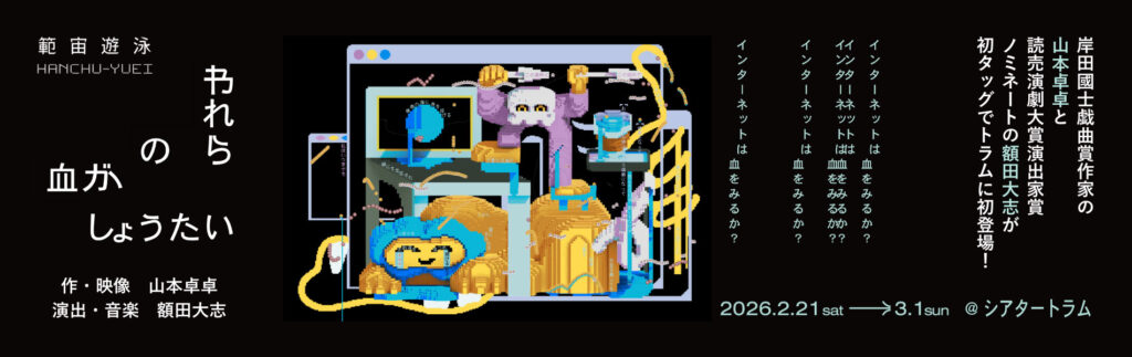 岸田國士戯曲賞作家の山本卓卓と、本年度の読売演劇大賞優秀演出賞に決定した額田大志が初タッグを組む範宙遊泳『われらの血がしょうたい』が、2月21日〜3月1日、シアタートラムに初登場する。演劇集団範宙遊泳(はんちゅうゆうえい)は、劇作家・演出家の山本卓卓を代表に、2007年から東京を拠点に活動。現実と物語の境界をみつめ、その行き来によりそれらの所在位置を問い直す。近年は舞台上に投写した文字・写真・色・光・影などの要素と俳優を組み合わせた独自の演出と、観客の倫理観を揺さぶる強度ある脚本で、日本国内のみならずアジア諸国からも注目を集め、マレーシア、タイ、インド、中国、シンガポール、ニューヨークで公演や共同制作も行っている。