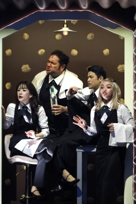特に、英国でミュージカル化されたのち、今回の日本での上演に際して、隅々までの手直しがなされて、シュワルツ曰く「初演と言ってもいい」と言うほどだという、今回の日本版を構成している、転換もコーラスもダンスもたった9人の俳優たちがすべてを担う舞台の醸し出す色合い。徹底的にシアトリカルで、ウィットに富み、微かにセクシーで大人っぽくもある作風は、振付を担うアディ・チャンの個性と、それを見事に体現した俳優たちの力量によって生まれている。