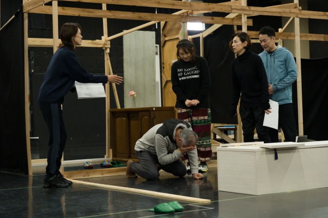 この場面を通した時点で、冨坂はキャストそれぞれに向けて緻密にリクエストを出していく。少し食い気味だった由美子のツッコミには「スピード感があっていいのだけど、治が過剰に泣いていることも観客にしっかり伝えておきたいのでもうワンテンポ待ってみて」というようなオーソドックスな注文があるのはもちろんのこと、部屋にあったギターを見つけて治が歌い出すところでは「自分勝手に振る舞う治の歌の合間に、由美子の合いの手がシンバルのように入る感じで」と言ったり、また千聖がその元夫婦のやりとりに割り込んでいくタイミングには「そこでボールを奪うように千聖のターンに移る」といった注文の仕方をしていて、わかりやすく面白い。部屋にいる人々の中で、由美子と尾田のコンビ、そのほかの面々とでグループ分けするようにリアクションに濃淡をつけたいと言っていたのも視覚的な効果が期待できそうで印象的だった。