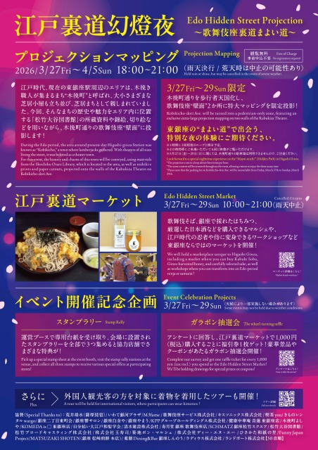 一般社団法人東銀座エリアマネジメントは、歌舞伎座の裏手に位置する木挽町通りで、3月27日〜4月5日までの10日間、プロジェクションマッピングイベント「江戸裏道幻燈夜 Edo Hidden Street Projection ―歌舞伎座裏道まよい道―」を開催。歌舞伎座の壁面を活用した映像演出が展開される。また3月27日(金)~29日(日)は、木挽町通りを歩行者天国化し、さまざまなイベントが開催される。