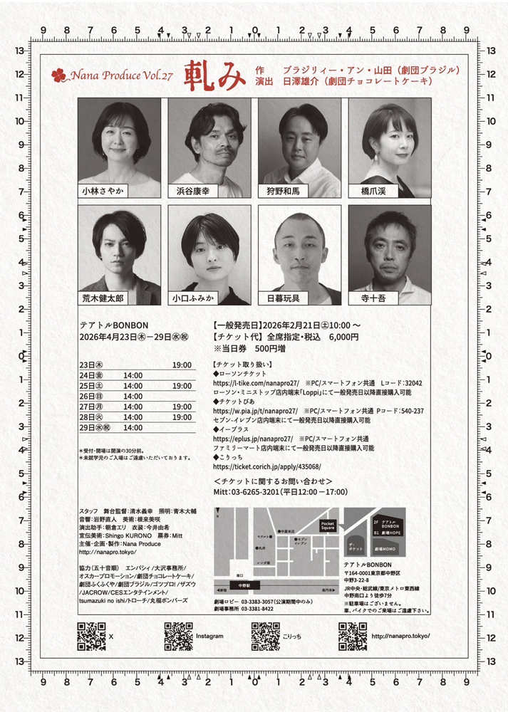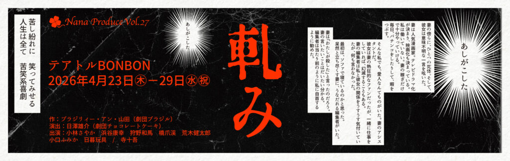 今回はNana Produce20周年記念公演として本作を上演します。2008年に劇団ブラジルが初演した作品を、令和の今に立ち上げることで新たな「軋み」をお届けできるはずです。演出は劇団チョコレートケーキの日澤雄介、出演は寺十吾、小林さやか、浜谷康幸ほか個性豊かな面々。濃密なキャラクターたちが織りなす世界を、キャスト・スタッフ一丸となって丁寧に立ち上げています。登場人物たちが軋んでいく様を、ぜひ劇場でご体感ください。苦笑系喜劇、皆様のご来場をお待ちしております。